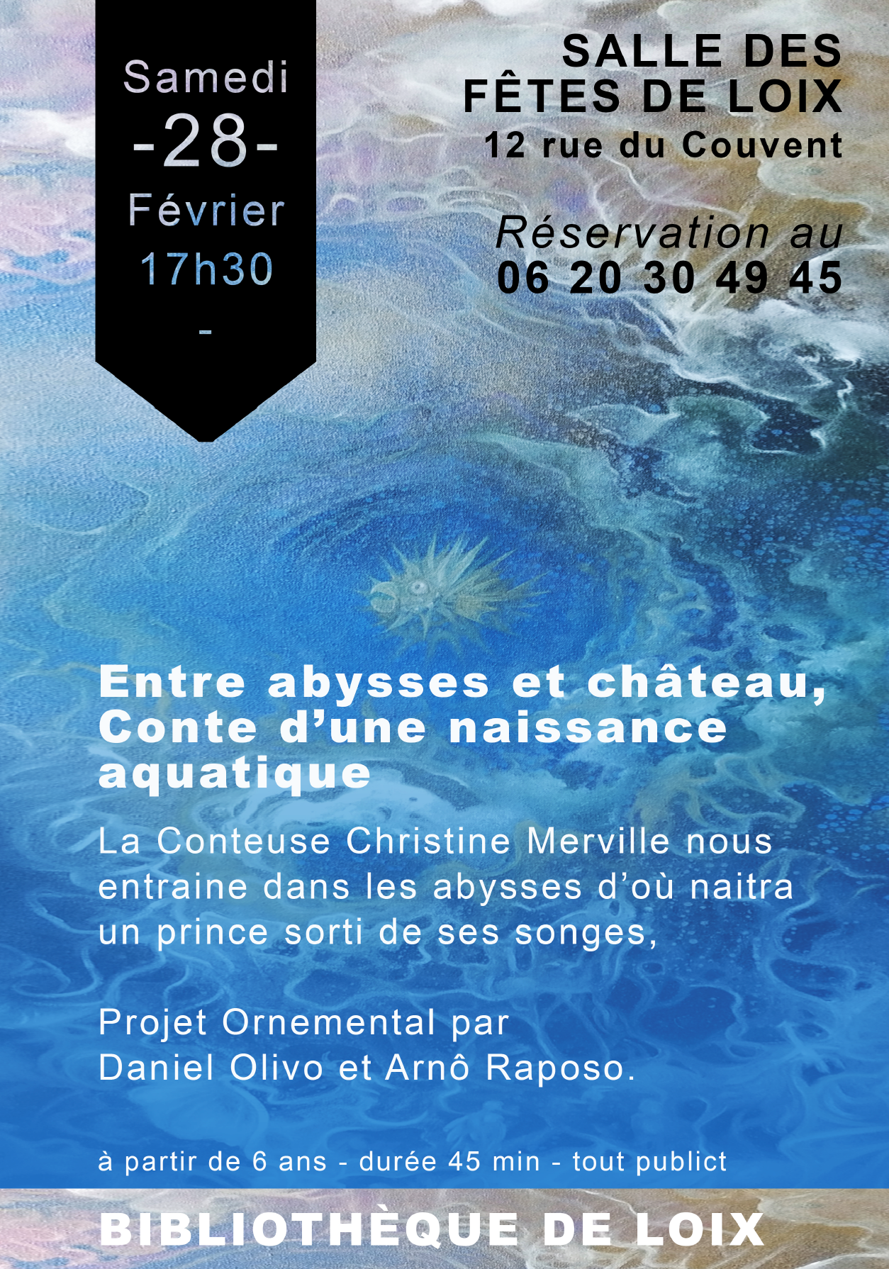 Entre abysses et château, conte d’une naissance aquatique + Ajouter à mon Agenda Google + iCal / Outlook export 00 jours 00 heures 00 minutes 00 secondes Date 28 Fév 2026 Heure 17:30 - 20:00 Lieu Salle des Fêtes 12, rue du couvent Catégorie Spectacles Organisateur La bibliothèque de Loix Email bibliothequeloix@gmail.com Site Web https://loix.bibenligne.fr/ Partagez cet événement
