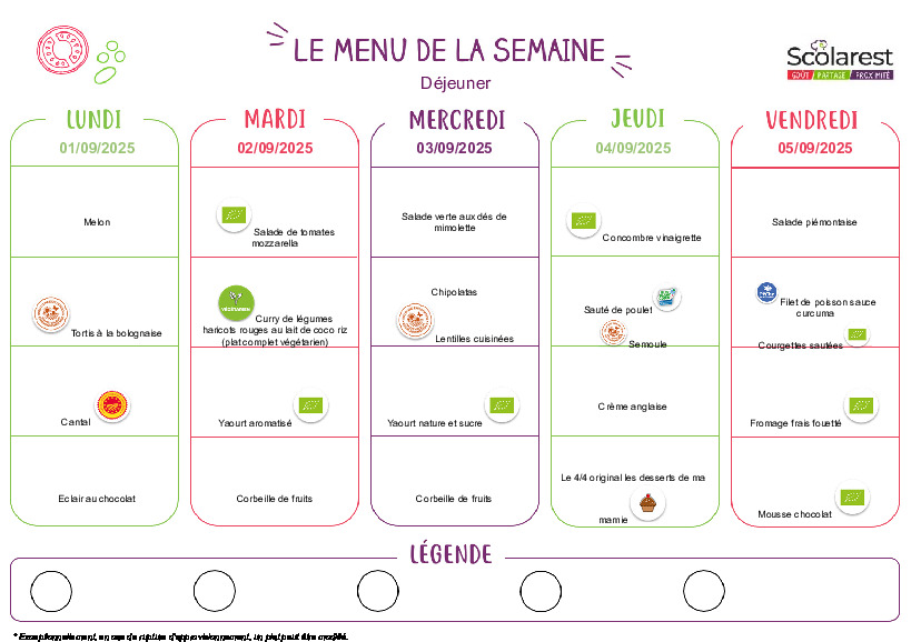 • Menus du 1er au 5 septembre 2025