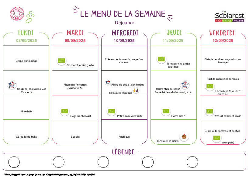 • Menus du 8 au 12 septembre 2025