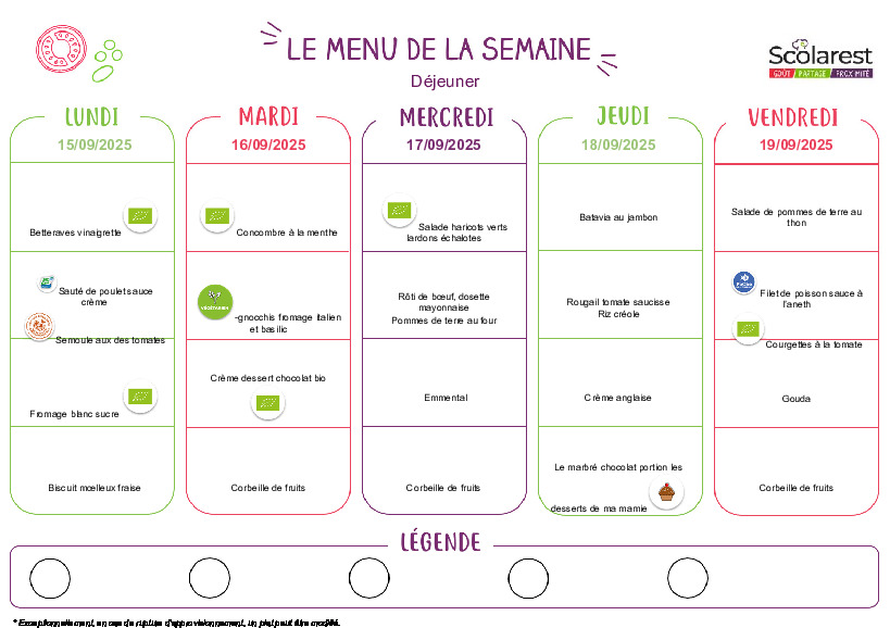 • Menus du 15 au 19 septembre 2025