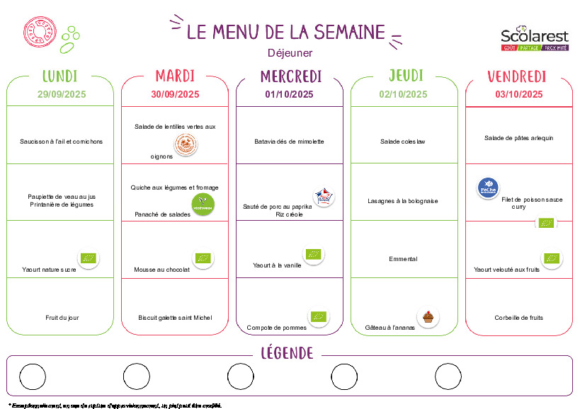• Menus du 29 septembre au 3 octobre 2025